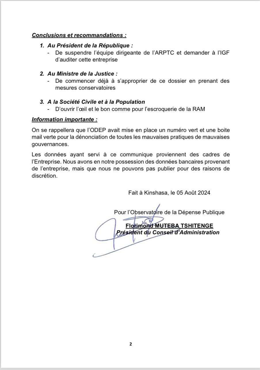 Dans un communiqué publié lundi 5 Août 2024, l'observatoire de la dépense publique ( ODEP), dénonce le pillage des ressources publiques, par les 7 membres de l'équipe dirigeante de l'Autorité de Régulation de la Poste et des Télécommunications du Congo (A.R.P.T.C), une structure rattachée à la présidence de la République.